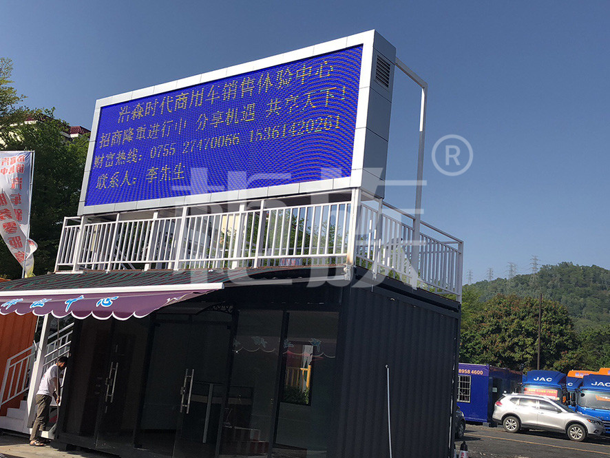 Small but fine office, the first floor office with awning, side stairs to the second floor platform. Strong bearing capacity, box top vertical LED advertising screen. The indoor toilet can be used for both accommodation and short rest.