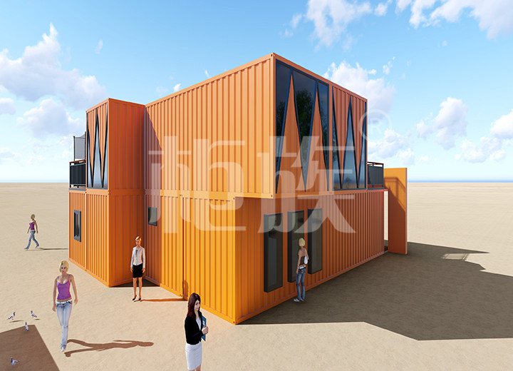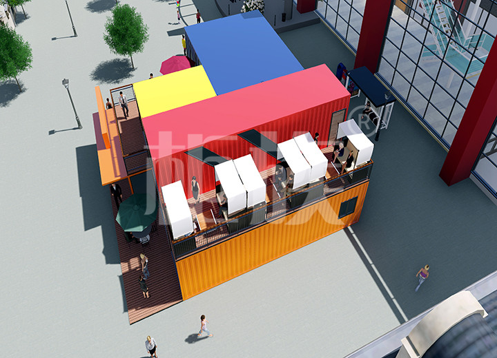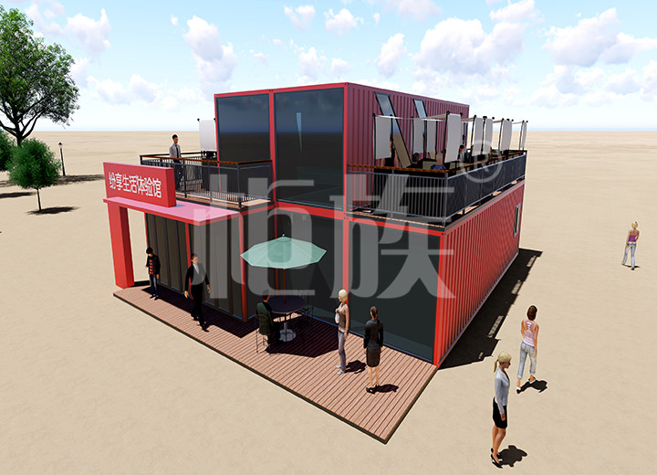 彩色外觀引人注目,集裝箱的隨意組合功能可以根據(jù)需要延展空間使用面積。一層可供展品擺放,二層陽臺(tái)可供休息娛樂。